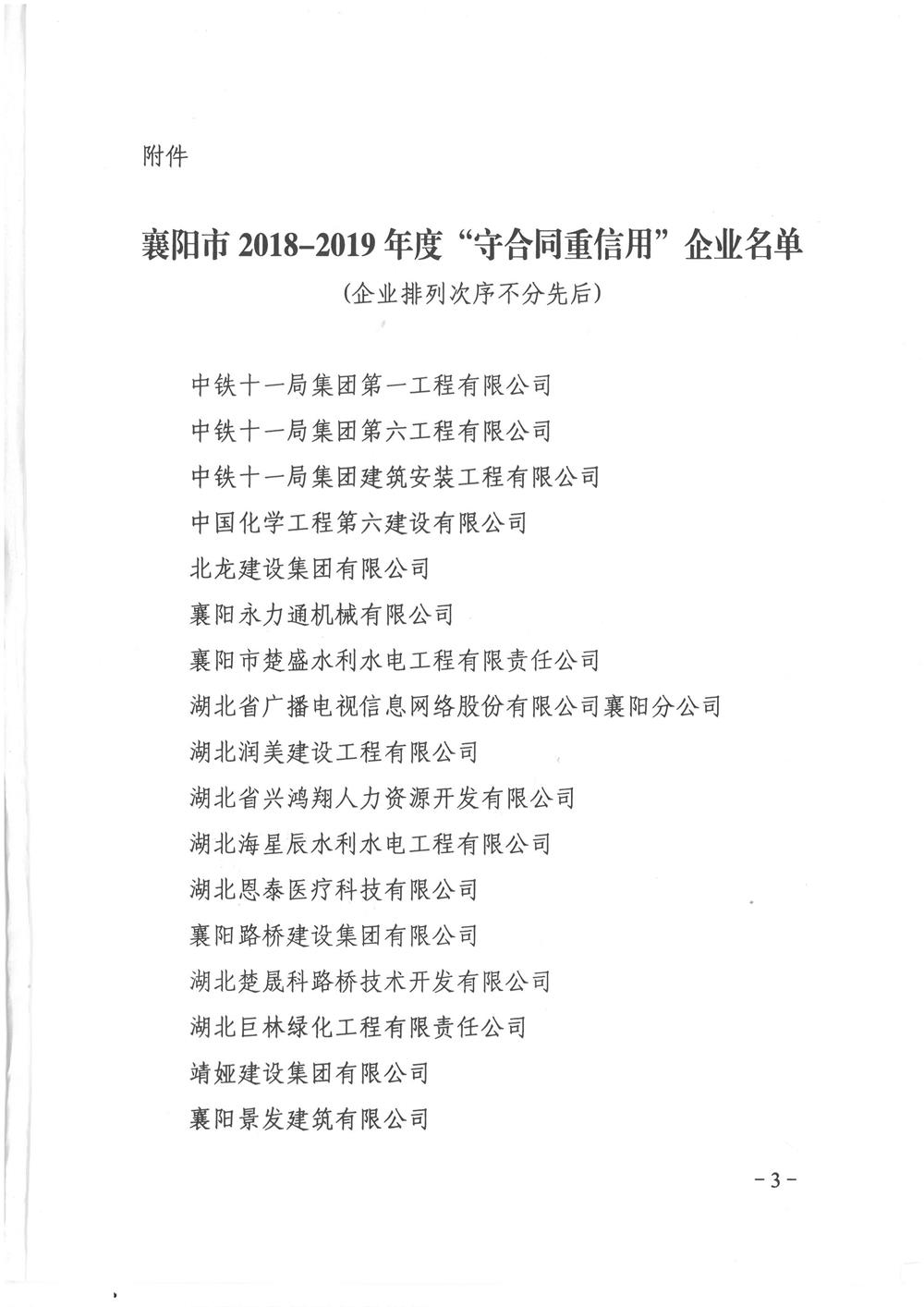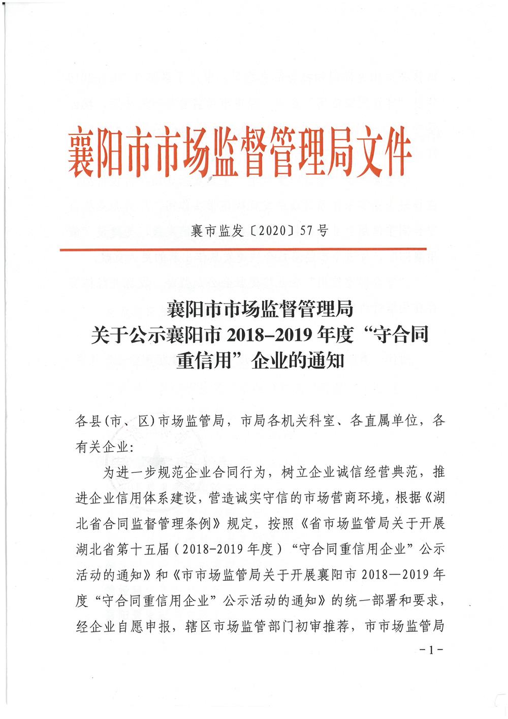 2018-2019年度襄陽市“守合同重信用”企業(yè) 2020.9.17