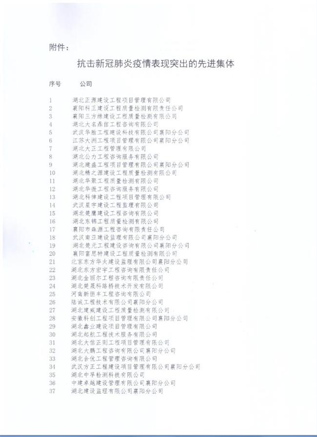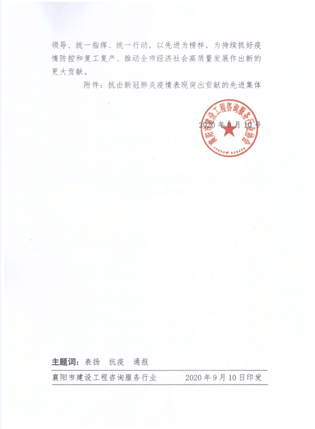 公司被襄陽市建設(shè)工程咨詢服務(wù)行業(yè)協(xié)會評為“抗擊新冠肺炎疫情”表現(xiàn)突出的先進(jìn)集體