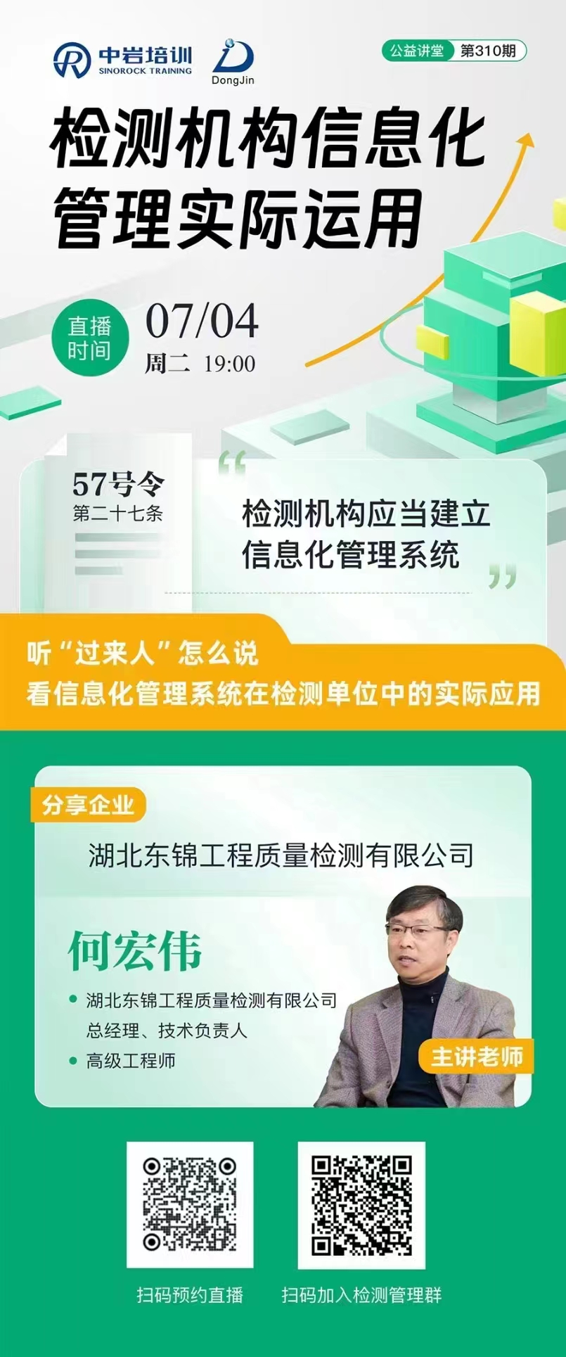 閱讀次數(shù):1049 發(fā)布時間:2023年07月07日2023年7月4日晚19:00,公司總經(jīng)理何宏偉應(yīng)邀在中巖培訓平臺親身講述檢測機構(gòu)信息化管理實際運用。他以一位“過來人”的身份向各位檢測同行分享信息化管理系統(tǒng)在檢測單位中的實際應(yīng)用。本次直播授課吸引了近三千名全國各地檢測行業(yè)的同行收聽,大家一致認同信息化管理在未來檢測單位運用是大勢所趨。