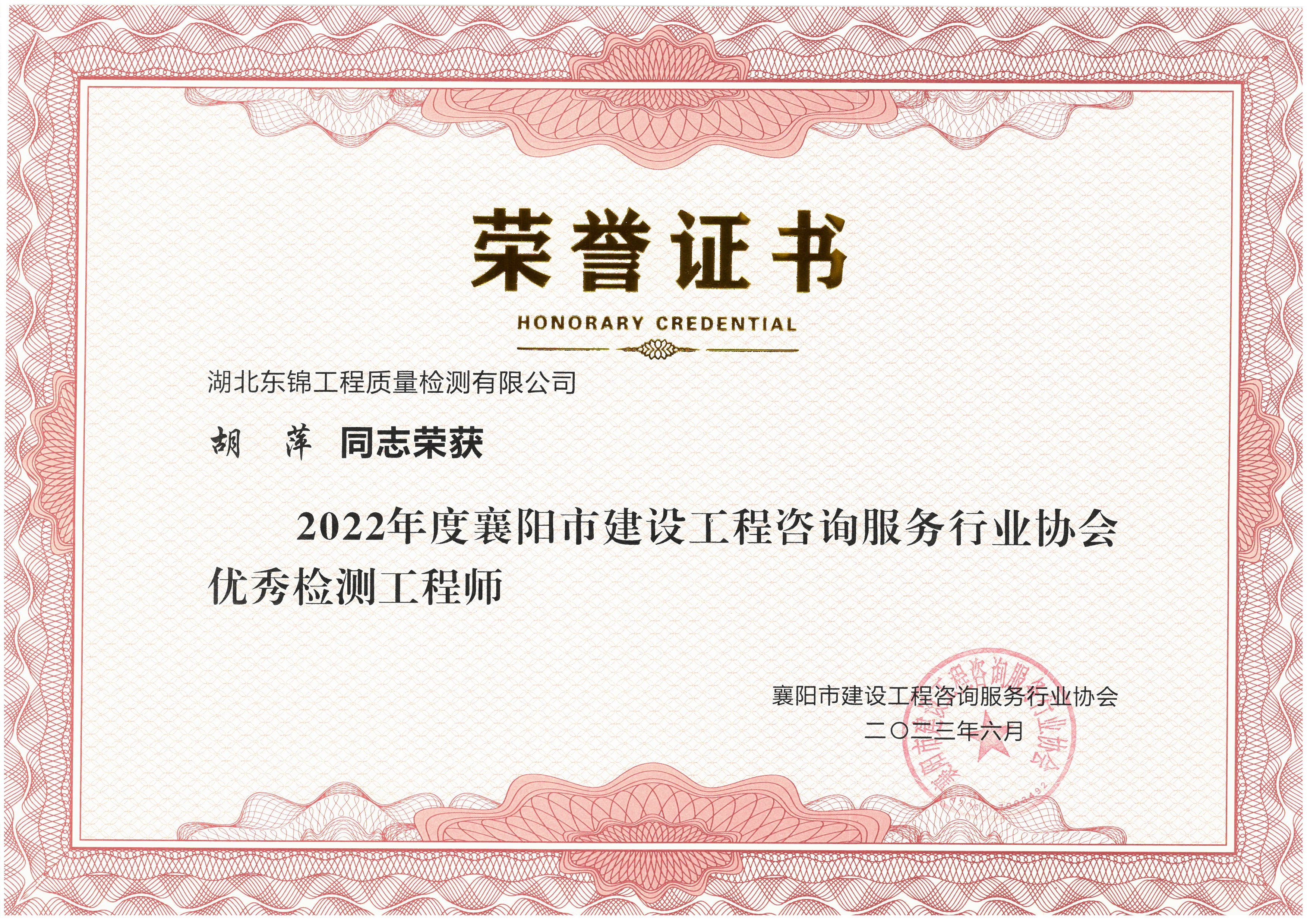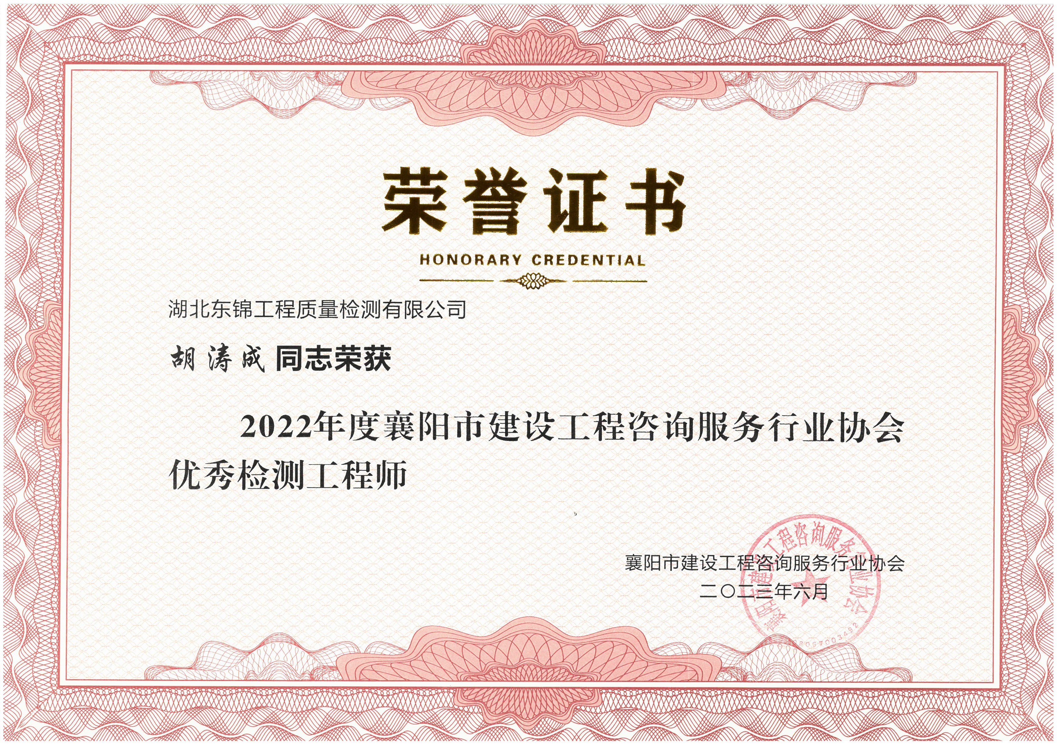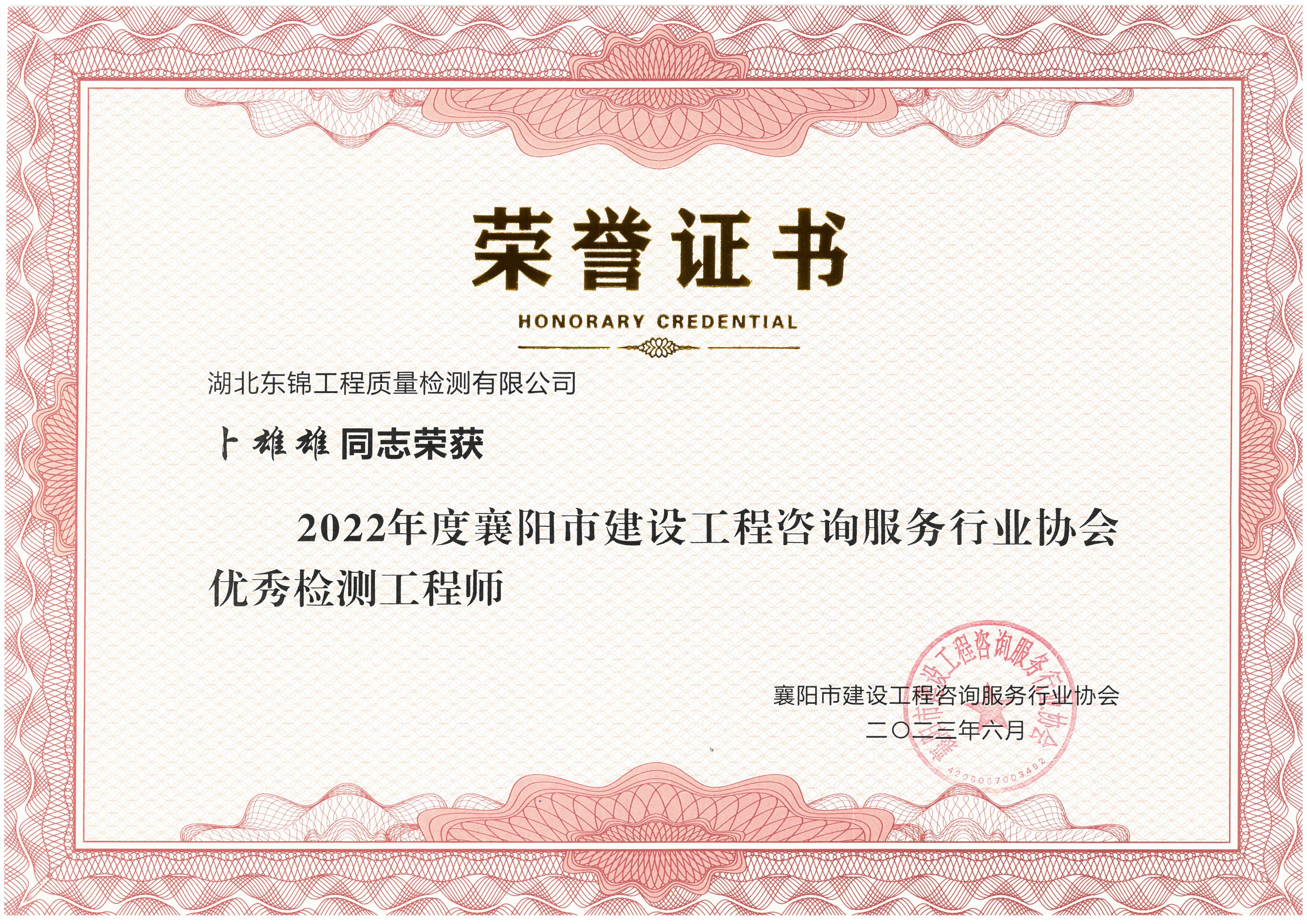 閱讀次數(shù):1170 發(fā)布時間:2023年07月14日2023年6月8日,襄陽市建設工程咨詢服務行業(yè)協(xié)會通報2022年度先進單位、優(yōu)秀檢測工程師名單。我公司榮獲先進單位稱號,公司員工胡萍、胡濤成、卜雄雄喜獲優(yōu)秀檢測工程師稱號。