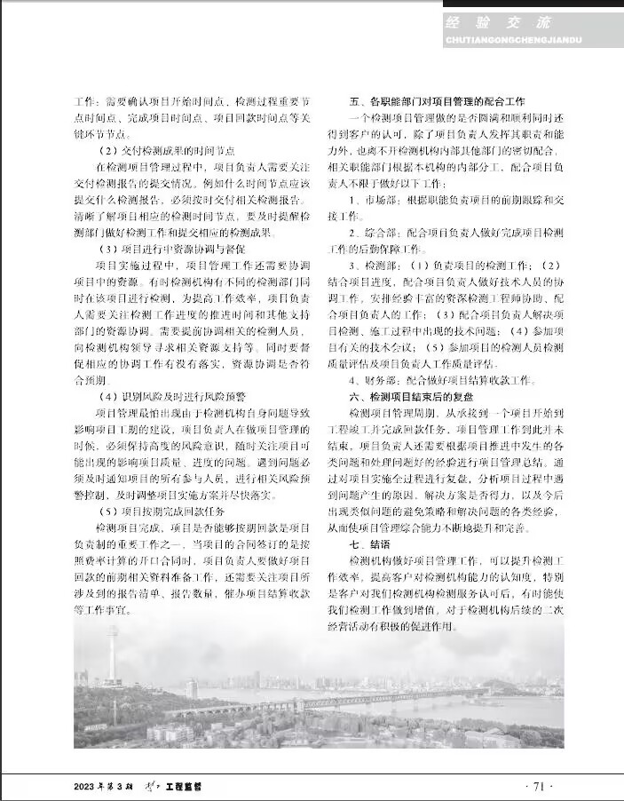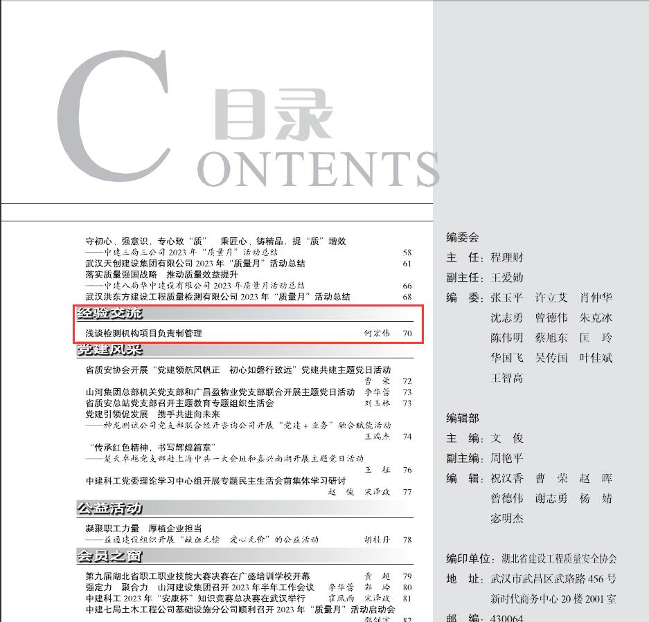 閱讀次數(shù):1047 發(fā)布時間:2023年10月25日2023年9月,公司何總撰寫的《淺談檢測機構項目負責制管理》一文在《楚天工程監(jiān)督》質量月專刊上發(fā)表。文中,何總從檢測項目負責制管理的主要內容、檢測項目負責人的素質和能力要求等六大方面闡述了檢測機構項目負責制管理對檢測行業(yè)的促進作用。
