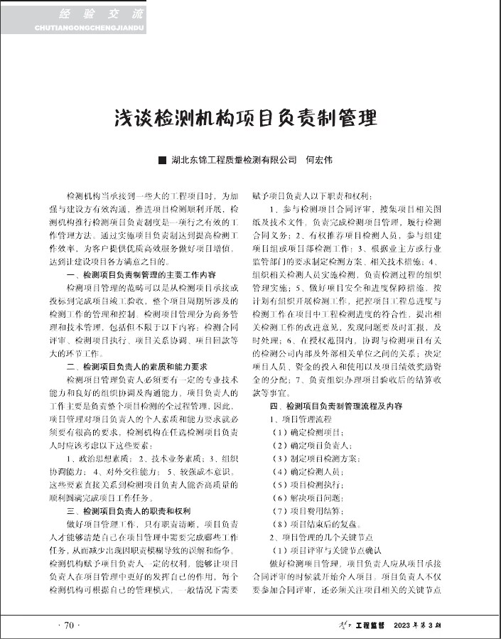 何總《淺談檢測機構項目負責制管理》在《楚天工程監(jiān)督》上發(fā)表