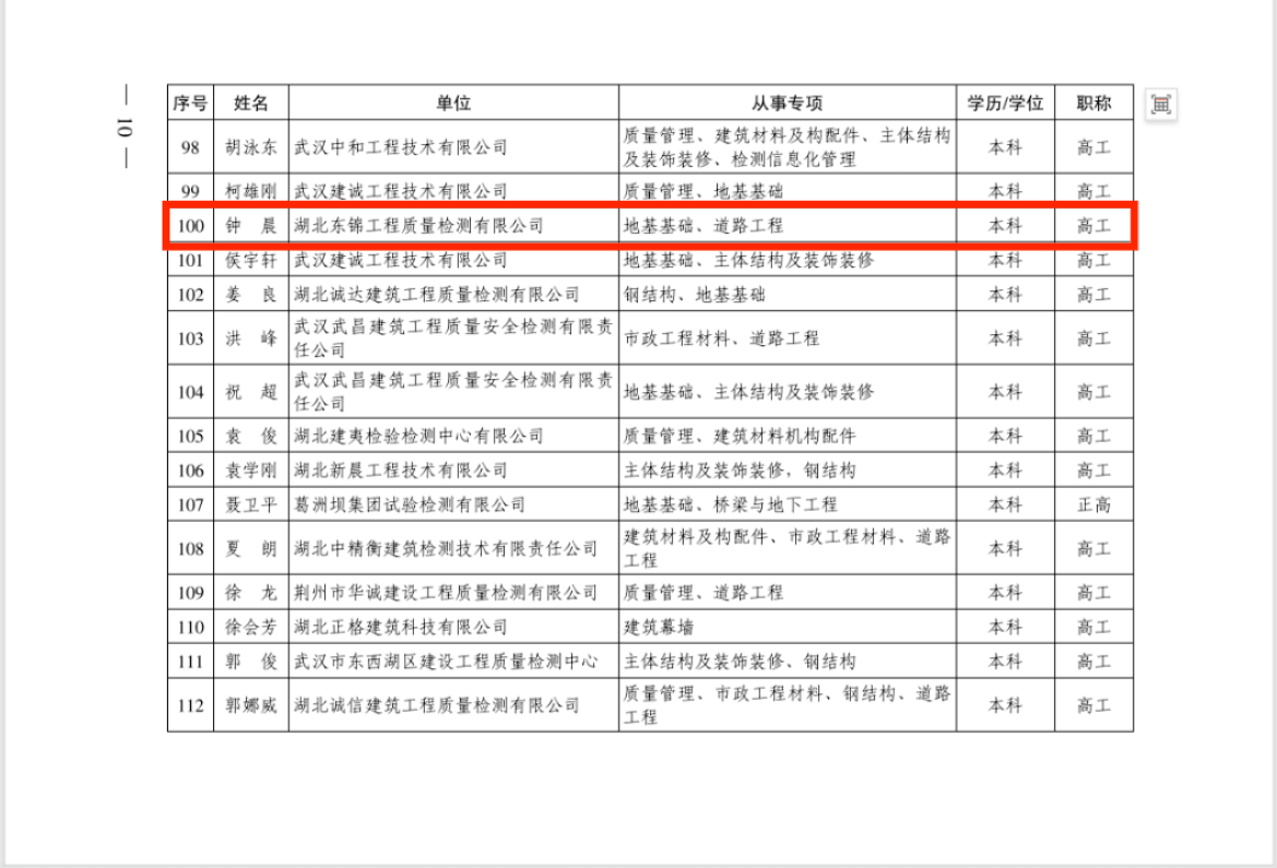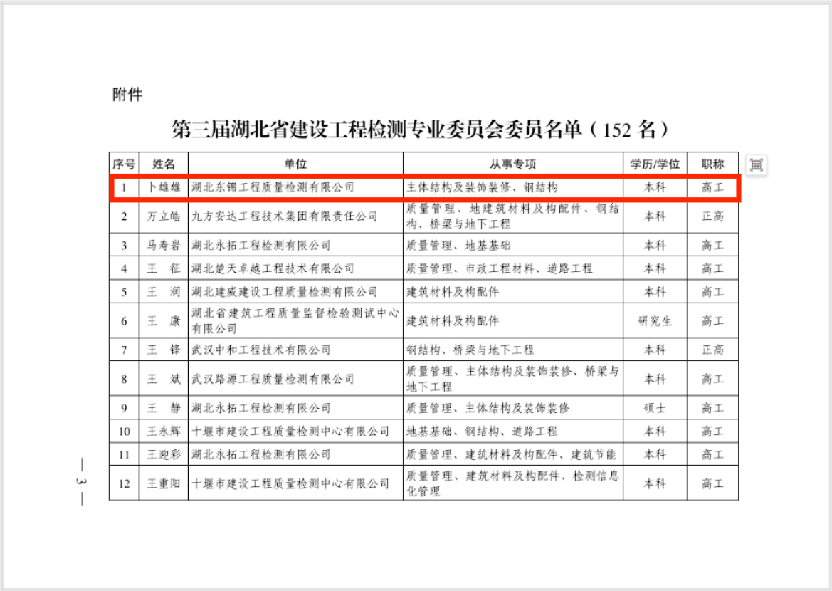 閱讀次數(shù):253 發(fā)布時間:2025年07月30日近日,湖北省建設(shè)工程質(zhì)量安全協(xié)會公布第三屆湖北省建設(shè)工程檢測專業(yè)委員會組成人員名單。我司何宏偉、鐘晨、胡萍、卜雄雄四人光榮入選第三屆湖北省建設(shè)工程檢測專業(yè)委員會委員名單。