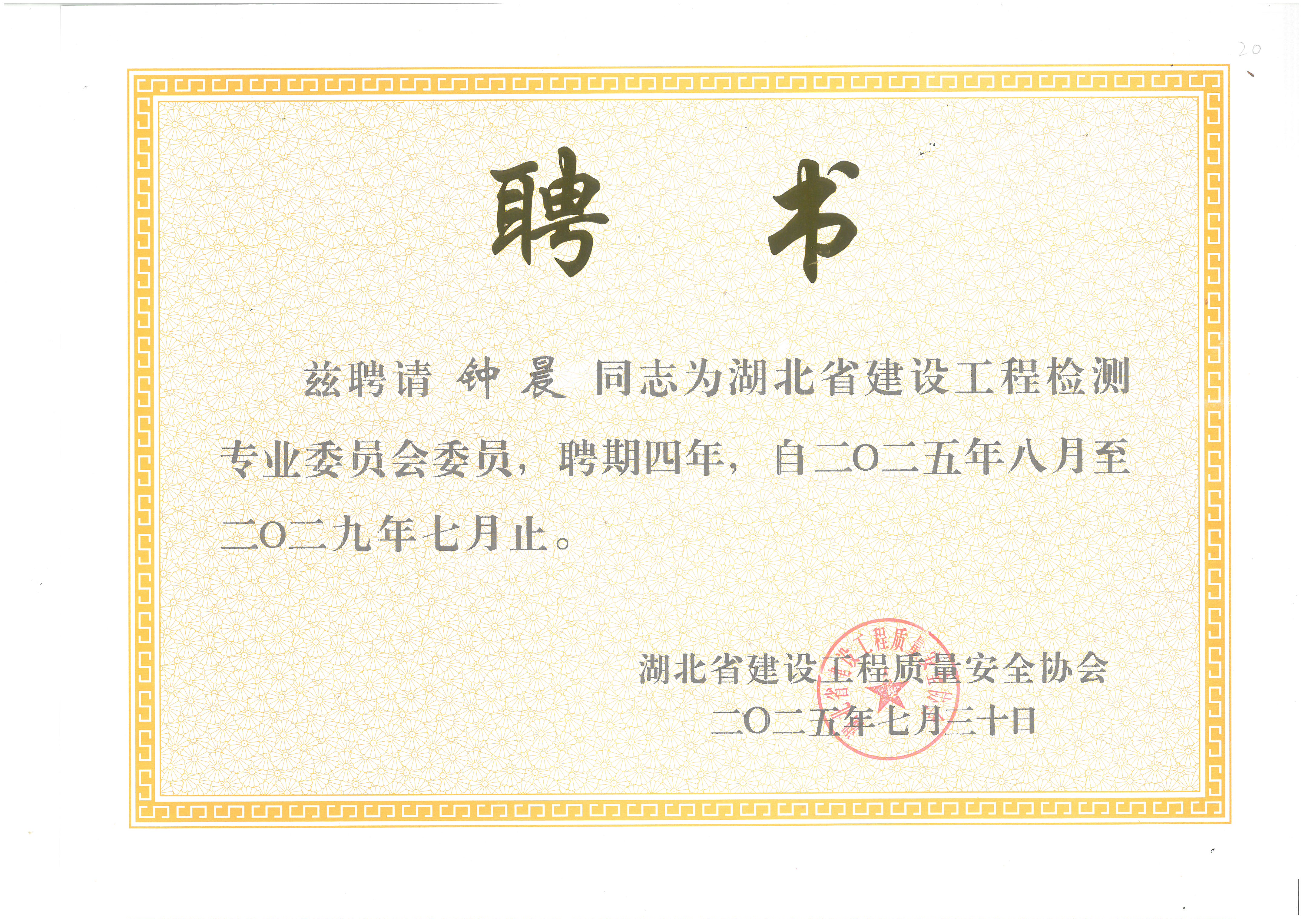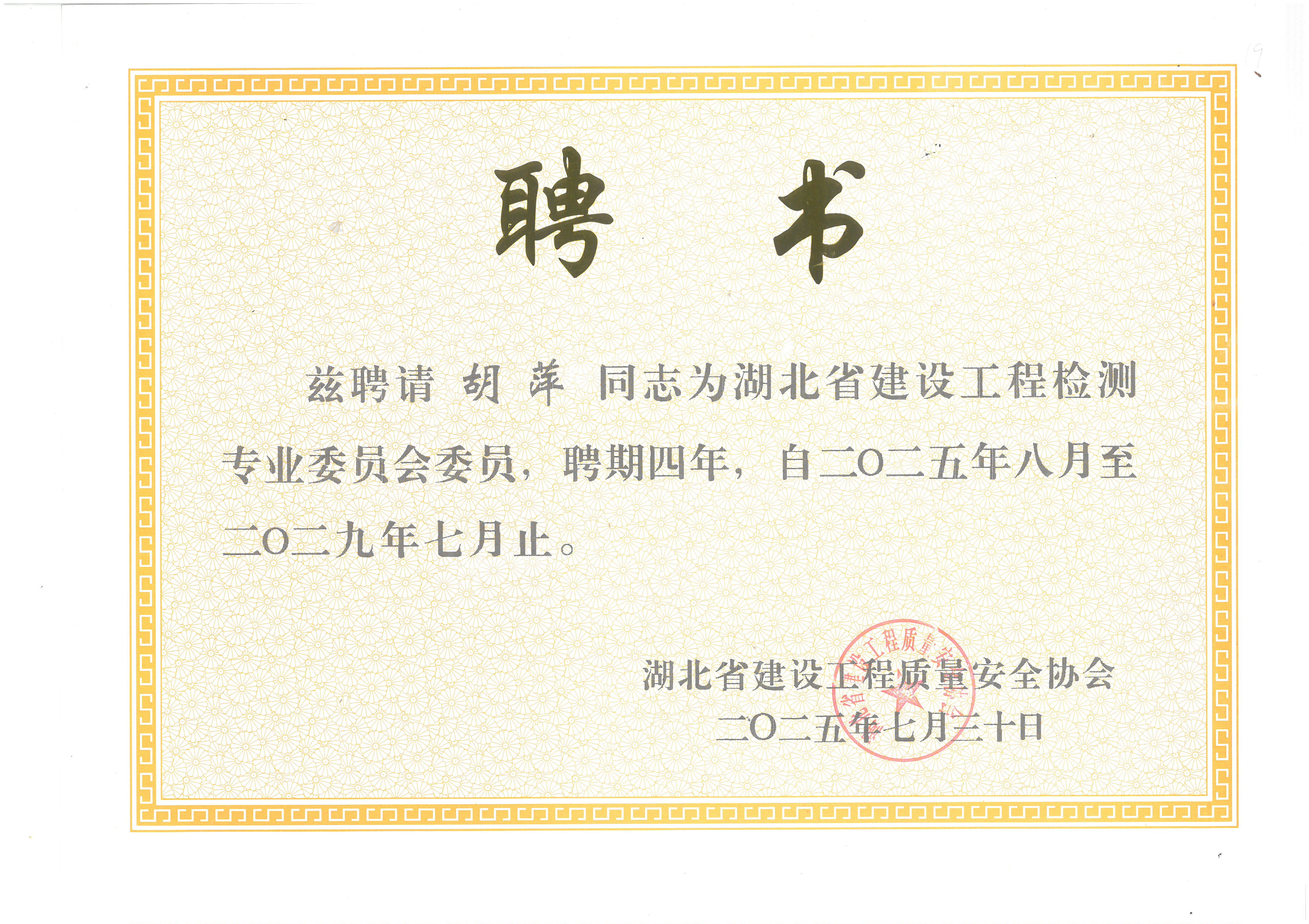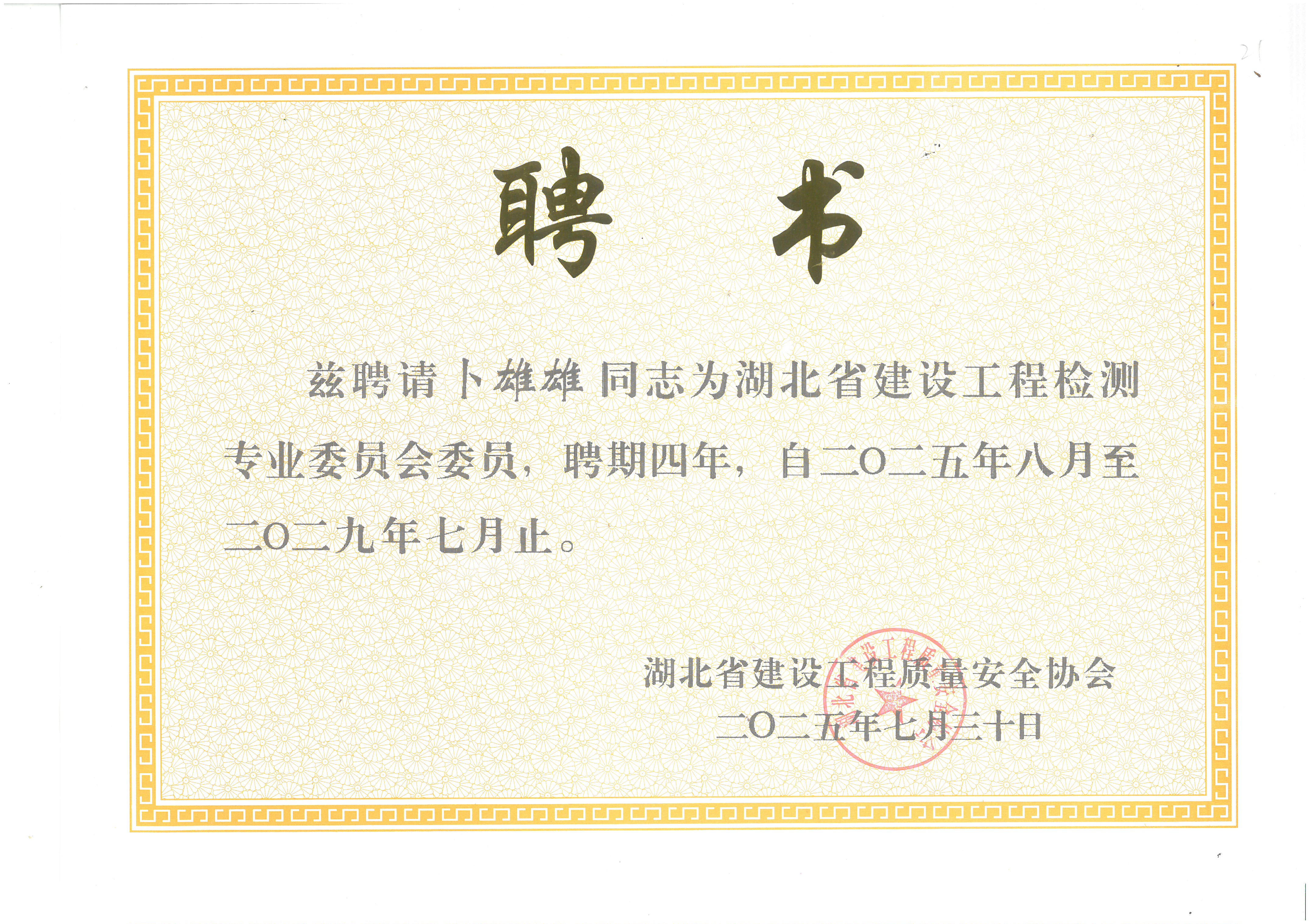 閱讀次數(shù):176 發(fā)布時間:2025年09月06日祝賀何總,胡萍總,鐘晨總,卜雄雄成為湖北省建設(shè)工程質(zhì)量安全協(xié)會專業(yè)委員會委員
