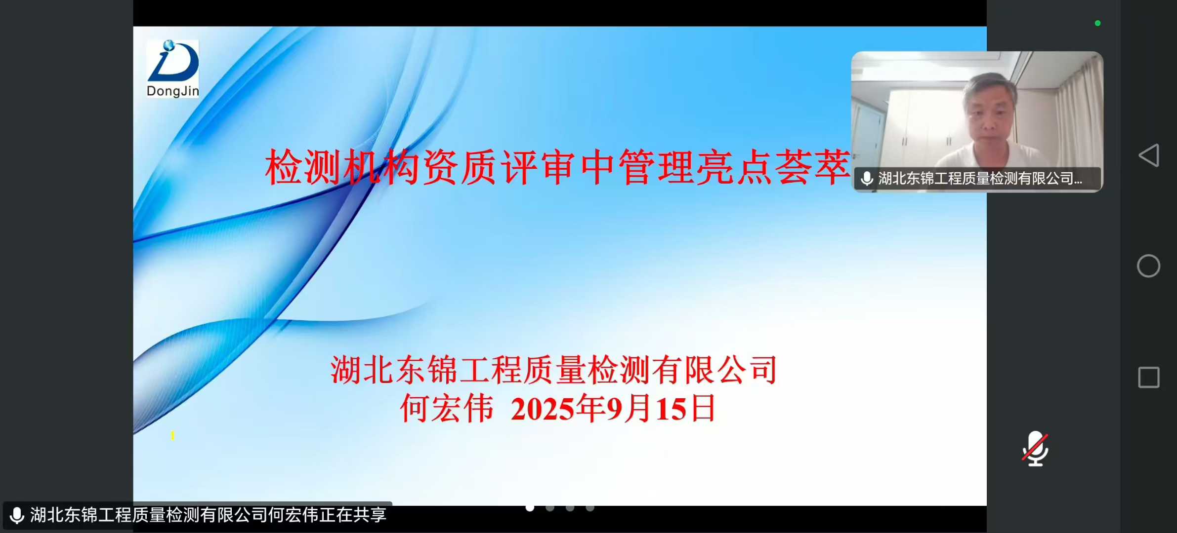 閱讀次數(shù):176 發(fā)布時間:2025年09月16日今年9月是全國第48個“質(zhì)量月”,為確?!辟|(zhì)量月”系列活動取得實效,湖北東錦工程質(zhì)量檢測公司總經(jīng)理何宏偉于15日19:00在線上開展《檢測機構(gòu)資質(zhì)評審中管理亮點薈萃》培訓(xùn)活動。